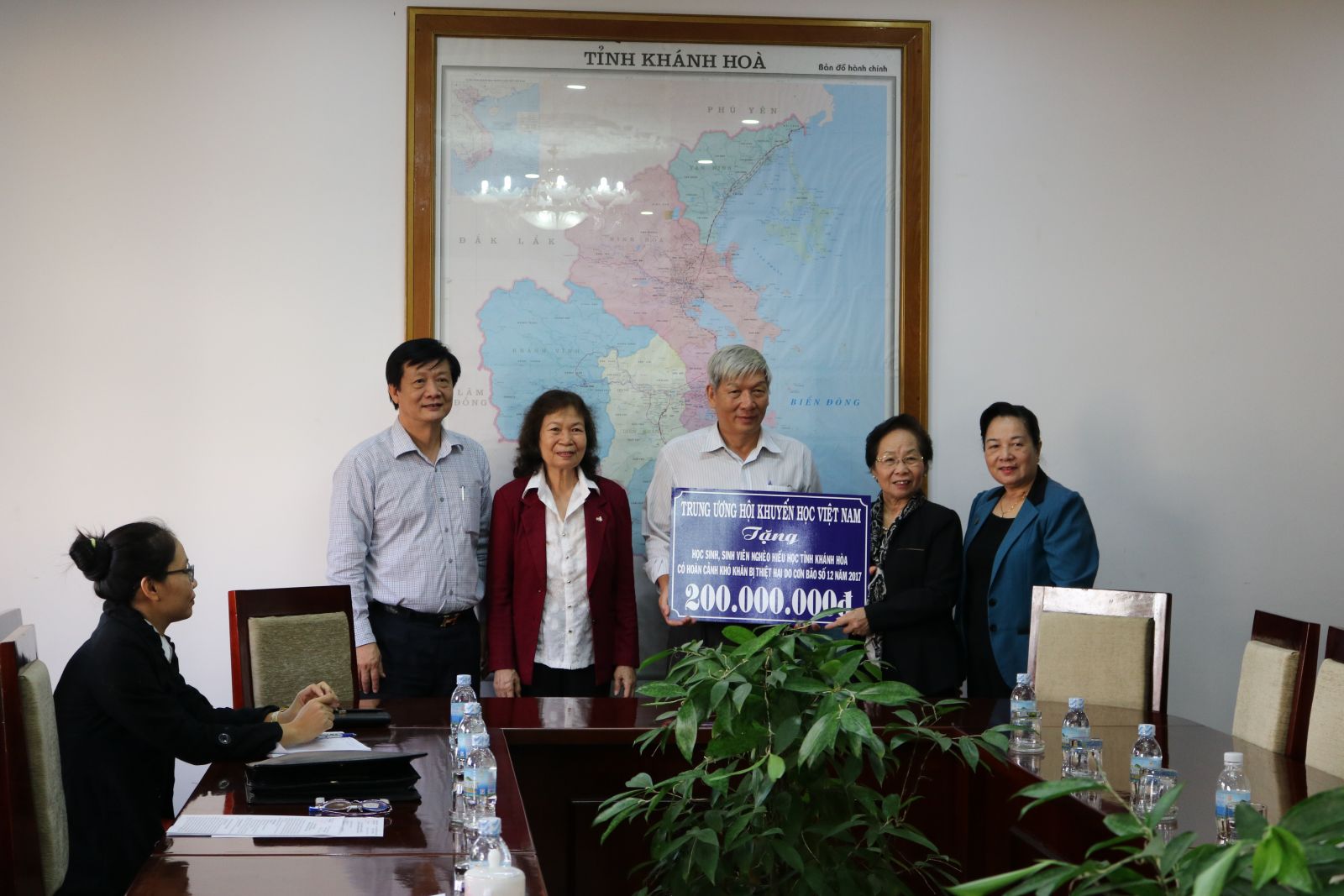 Tại buổi làm việc và gặp mặt lần này, Hội Khuyến học tỉnh Khánh Hòa cũng báo cáo tổng kết qua về công tác khuyến học, khuyến tài trong năm 2017 vừa qua và tiếp nhận hỗ trợ của Hội Khuyến học Việt Nam giúp đỡ học sinh, sinh viên có hoàn cảnh khó khăn, bị thiệt hại do bão số 12 với tổng số tiền là 200.000.000 (Hai trăm triệu đồng).