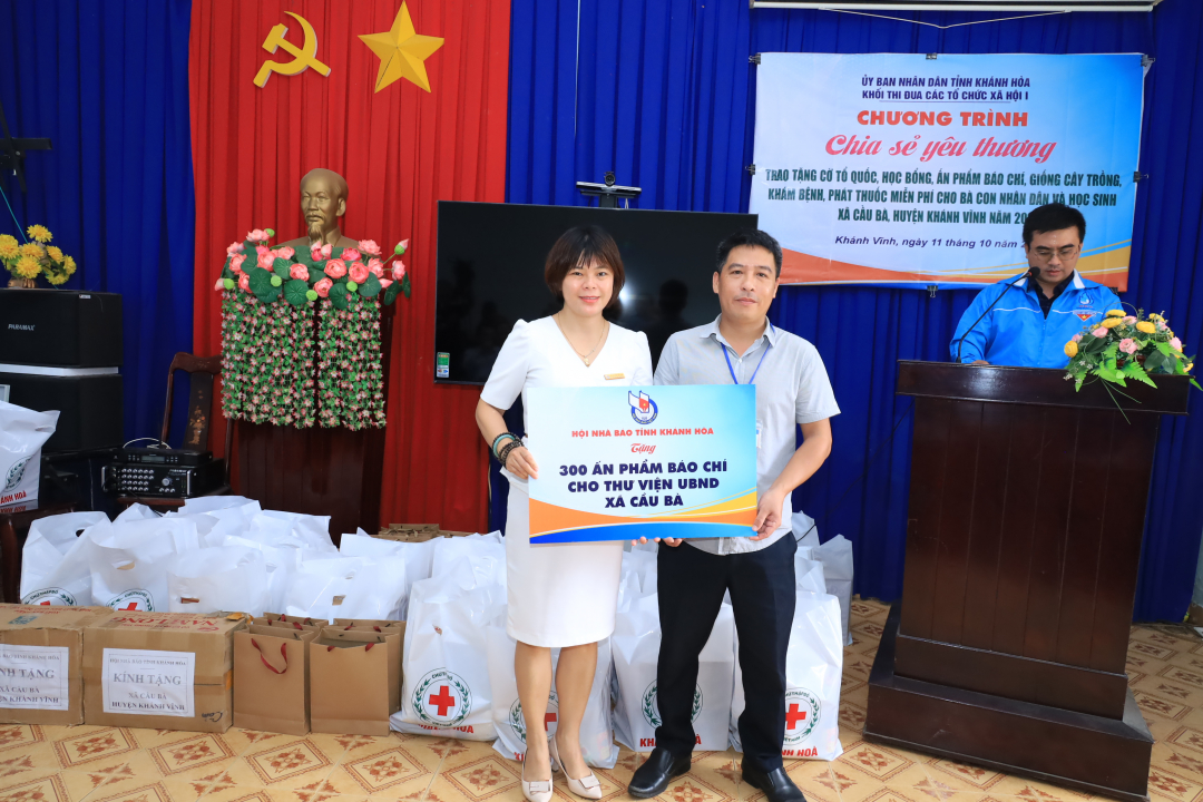 Đại diện Hội Nhà báo tỉnh trao ấn phẩm báo chí, tài liệu tuyên truyền cho UBND xã Cầu Bà.
