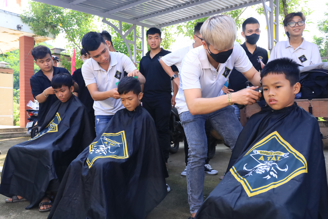 Cắt tóc miễn phí cho trẻ em ở xã Cầu Bà.