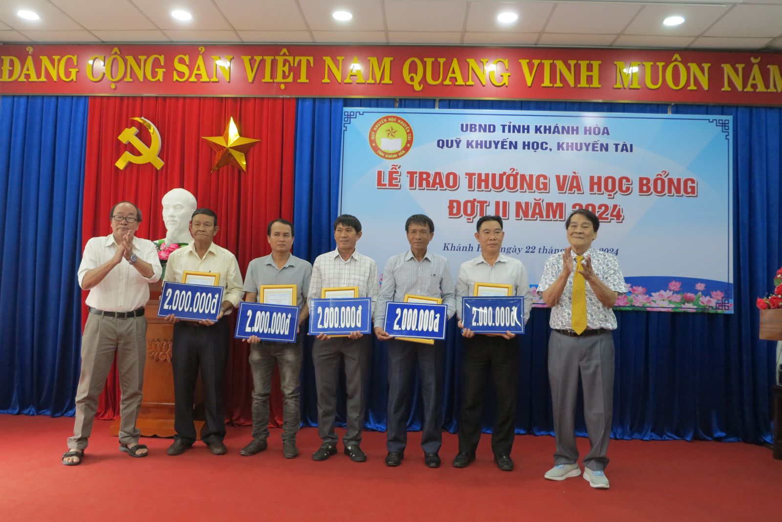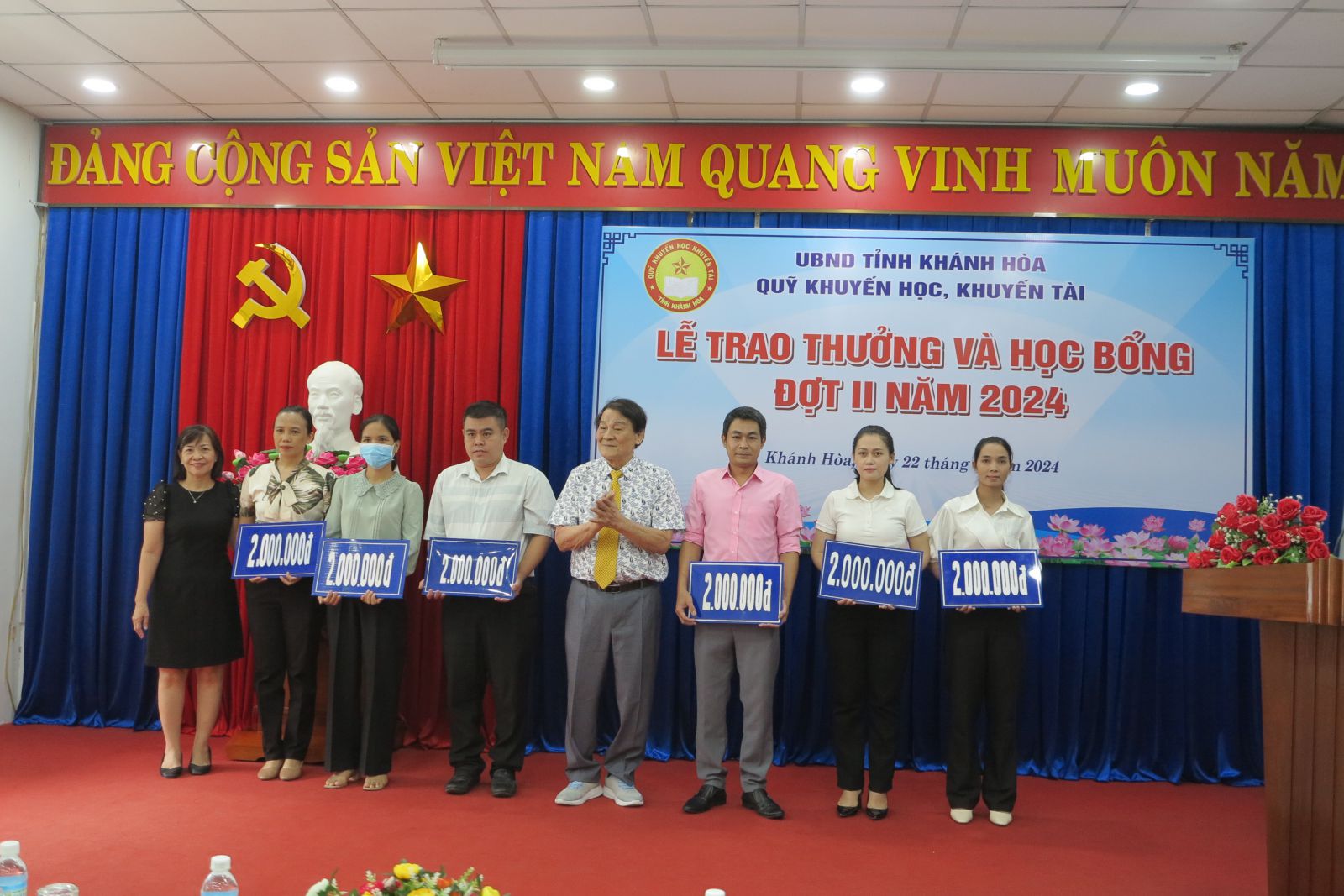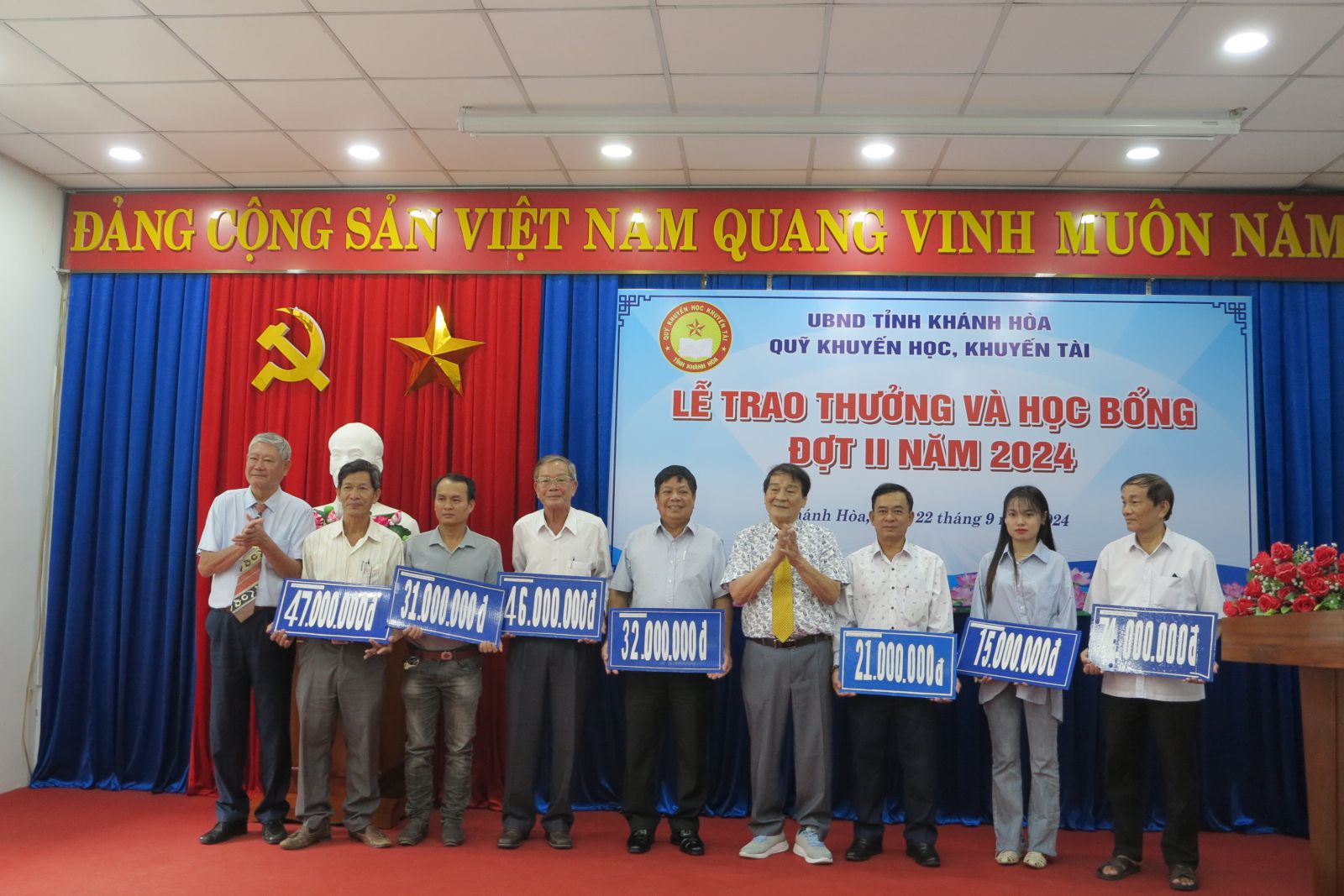 Tại buổi lễ, Quỹ Khuyến học, khuyến tài Khánh Hòa đã trao 374 suất học bổng, phần thưởng cho các học sinh, sinh viên, giáo viên... với tổng số tiền 841 triệu đồng. Trong đó, có 340 suất học bổng với tổng số tiền hơn 773 triệu đồng cho học sinh, sinh viên nghèo hiếu học; 34 phần thưởng với tổng số tiền 68 triệu đồng cho sinh viên xuất sắc của các trường cao đẳng, đại học trong tỉnh năm học 2023-2024, thủ khoa tốt nghiệp THPT, học sinh đạt điểm cao xét tuyển vào đại học, thầy cô giáo có hoàn cảnh khó khăn, người lớn tuổi có thành tích trong lao động sản xuất đem lại hiệu quả kinh tế gia đình và lan toả cộng đồng.