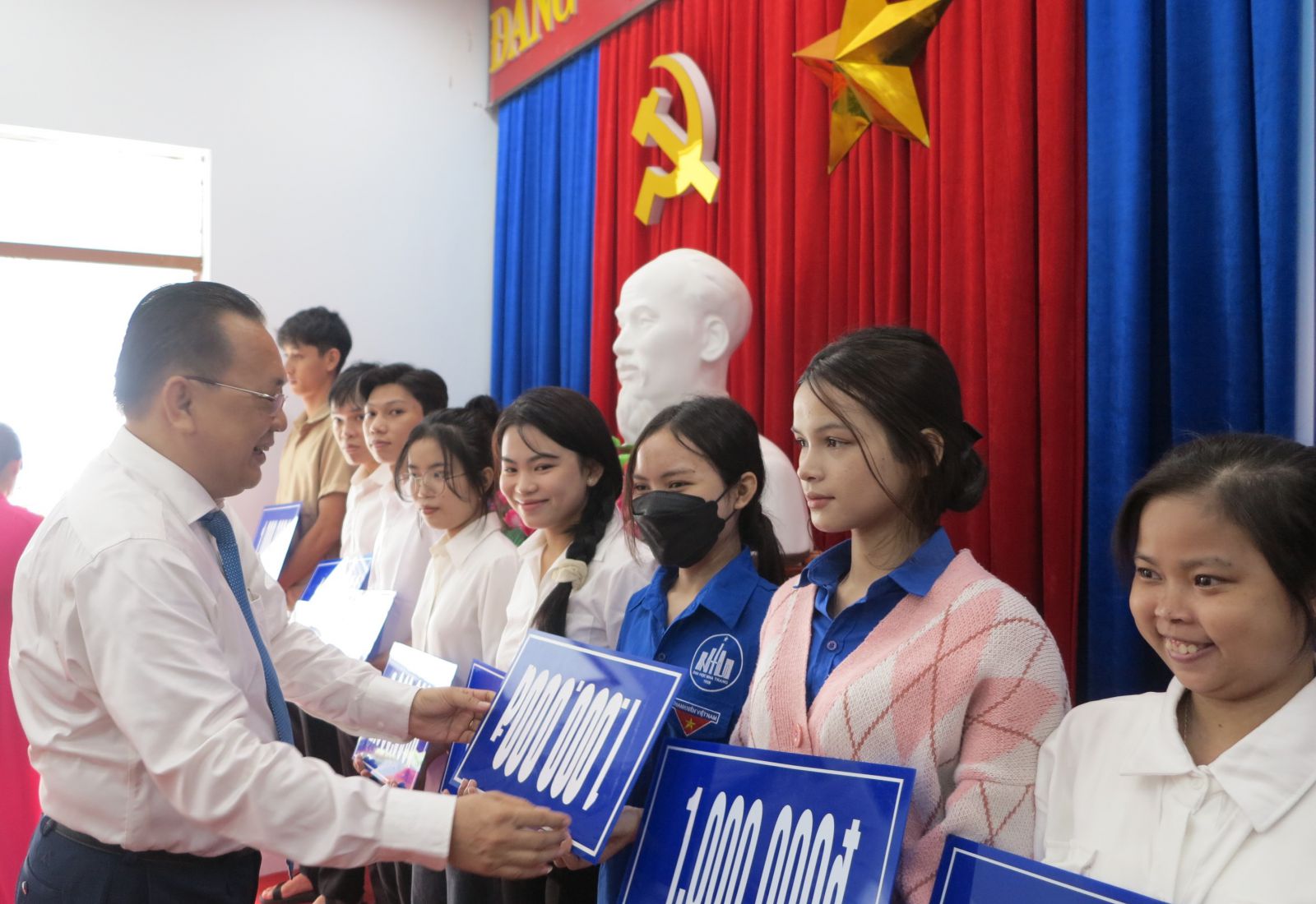 Ông Lê Hữu Hoàng trao học bổng, phần thưởng cho các học sinh, sinh viên.