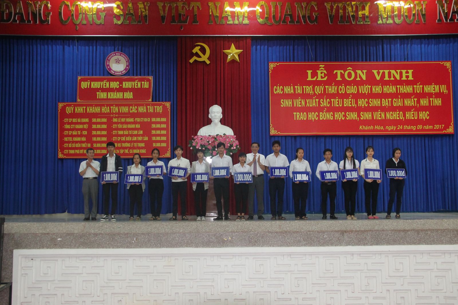 Các học sinh, sinh viên được nhận học bổng của Quỹ đều đã có nghị lực vượt qua mọi khó khăn, nhiều em vừa đi học, vừa lao động phụ cùng gia đình, hoặc làm thuê để có thêm tiền ăn học, các em luôn nỗ lực vươn lên trong học tập và rèn luyện, có nhiều em đã trở thành học sinh, sinh viên giỏi. Như học sinh Nguyễn Tự Cường ở Diên Khánh, hoàn cảnh gia đình khó khăn, 3 năm học THPT, sau giờ lên lớp em vẫn đi chăn bò thuê để thêm tiền ăn học; tốt nghiệp THPT, em thi trúng tuyển 3 trường Đại học; em đã được Quỹ trao học bổng thường xuyên; Năm thứ nhất , năm thứ 2 em đều là sinh viên giỏi của trường Đại học Y khoa Huế. Học sinh Trương Thiên Ân ở Nha Trang, hoàn cảnh gia đình khó khăn, khi em trúng tuyển Đại học chuyên ngành Kế Toán – Đại học Công Nghiệp TpHCM, cha em không may bị tai nạn giao thông, mẹ em bị tai biến, em Thiên Ân đứng trước nguy cơ bỏ học; Quỹ Khuyến học, khuyến tài đã kịp thời trao học bổng, Hội Khuyến học đã vận động một số nhà hảo tâm giúp đỡ, em Ân đã có kinh phí đi TpHCM nhập học, từ đó đến nay Quỹ học bổng mỗi năm đã trao học bổng thường xuyên để trợ giúp em. Em Võ Nhật Duy – học sinh trường tiểu học Vĩnh Thạnh – Nha Trang, bố mẹ em đều bị mù, gia đình rất khó khăn, Quỹ Khuyến học đã cấp học bổng thường xuyên để em thêm phần kinh phí tiếp tục đến trường. Ngày 12/9/2017 Qũy trao học bổng cho 42 tân sinh viên, mỗi em 7 triệu đồng để tiếp bước đến trường. Các em đều có hoàn cảnh rất khó khăn nhưng đều có ý chí và nghị lực nên đã vươn tới giảng đường Đại học. Như em Lê Văn Hùng ở huyện Vạn Ninh, gia đình nghèo, cha mẹ đã qua đời do tai nạn giao thông, Hùng và các em ở với ông bà nội già yếu đã ngoài 80, hàng ngày ông bà chăn bò thuê để kiếm tiền, ngoài giờ học em Hùng phụ ông bà chăn bò, kỳ thi năm 2017 em đã trúng tuyển ngành công nghệ thông tin trường Đại học Nha Trang. Em Phạm Thị Mỹ Chi ở Ninh Hòa, em không có cha, mẹ lâm bệnh qua đời khi em đang học lớp 3, ở với bà ngoại đã già yếu vẫn làm thuê kiếm tiền nuôi cháu; Ngoài giờ học em Chi đi bưng bê ở nhà hàng để thêm tiền ăn học. Kỳ thi Đại học năm 2017, em đã trúng tuyển ngành Kinh tế ngoại thương, trường Đại học Nha Trang…Mỗi em trong diện Quỹ đã trao học bổng đều có hoàn cảnh vô cùng khó khăn, sự yêu thương, đùm bọc của gia đình, sự quan tâm của các nhà tài trợ và các tổ chức xã hội đã luôn tiếp sức để các em tiếp tục vượt khó, nỗ lực vươn lên trong học tập và rèn luyện.