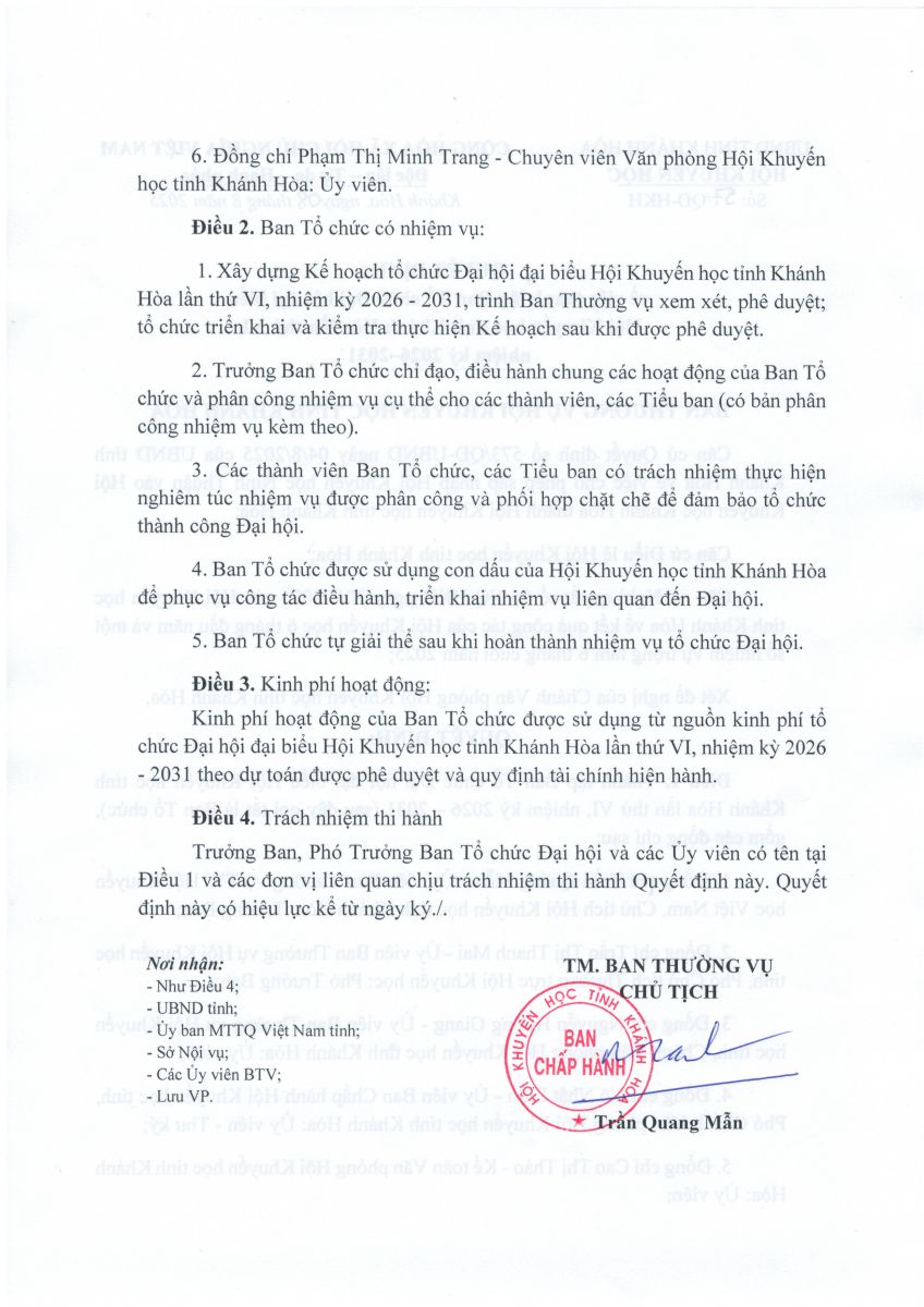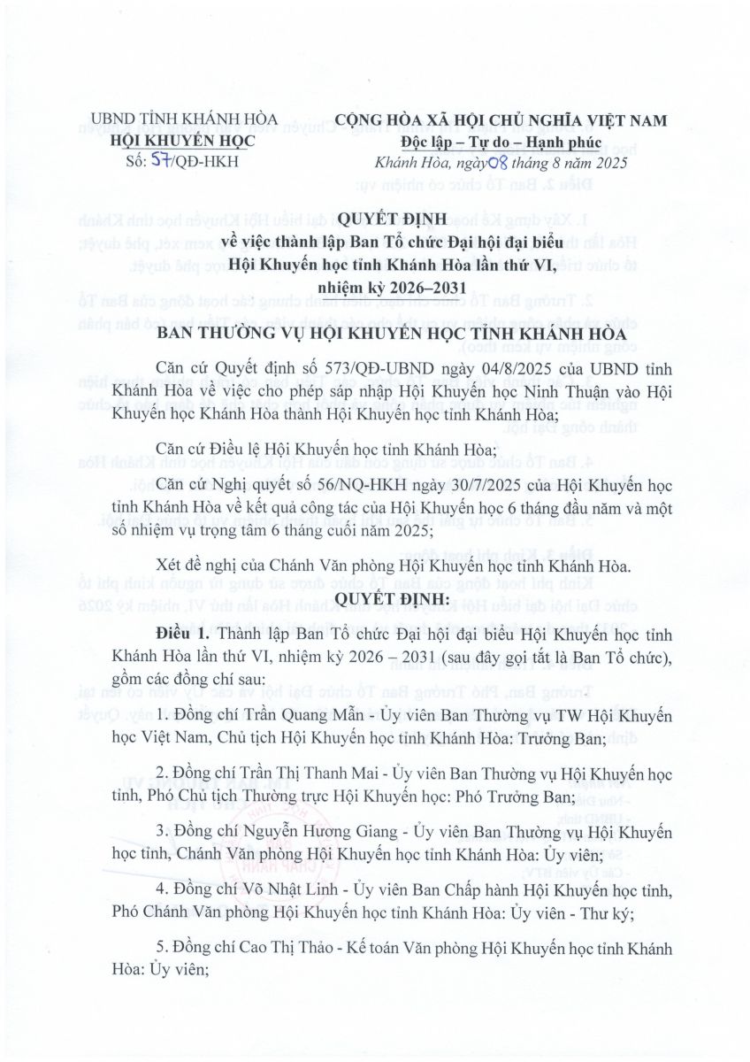 Quyết định về việc thành lập Ban Tổ chức Đại hội đại biểu Hội Khuyến học tỉnh Khánh Hòa lần thứ VI nhiệm kỳ 2026 - 2031