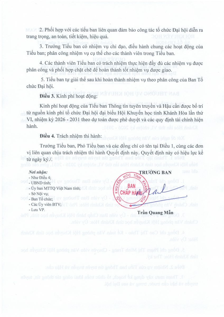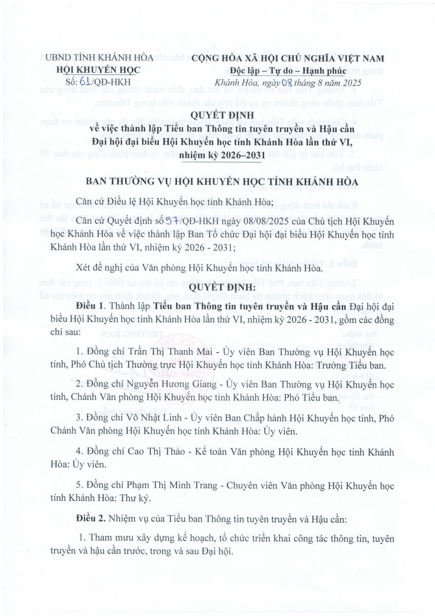 Quyết định về việc thành lập Tiểu ban Thông tin tuyên truyền và Hậu cần Đại hội đại biểu Hội Khuyến học tỉnh Khánh Hòa lần thứ VI nhiệm kỳ 2026 - 2031