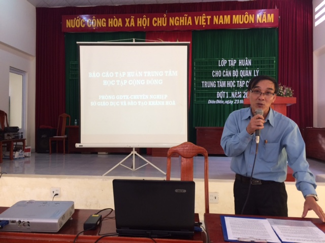 Tổ chức tập huấn cho Cán bộ Trung tâm học tập cộng đồng các xã, thị trấn ở huyện Diên Khánh Được sự nhất trí của Sở Giáo dục - Đào tạo Khánh Hòa và UBND huyện Diên Khánh, sáng ngày 23 tháng 02 năm 2017, tại UBND xã Diên Điền, Phòng Giáo dục - Đào tạo huyện kết hợp với Hội Khuyến học huyện tổ chức tập huấn nghiệp vụ cho cán bộ phụ trách Trung tâm học tập cộng đồng các xã, thị trấn.